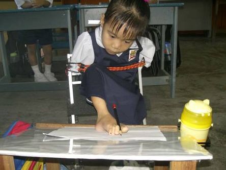 天天这样写,因脚骨没力,有时写得看不见字迹,妈妈就换了色泽较黑的铅笔给她,约几个月后终于可用脚写出像样的字。