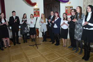 当晚,使馆张灯结彩,洋溢着浓厚的节日气氛。来自维泽梅大学、拉脱维亚大学、斯特拉京什大学和里加文化中学的同学们纷纷上台展示才艺,动听的中国歌曲、优美的诗朗诵、绘声绘色的春节习俗介绍以及精心设计的歌舞情景剧表演赢得在场来宾的阵阵掌声。随后,来宾们一面品尝中国美食,一面饶有兴致地欣赏去年在湖南举办的第八届“汉语桥”中文比赛集锦并交流学习中文的体会,使馆内一片欢声笑语。