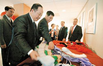 图为广东侨办主任吴锐成(左二)拜会中华文化中心,捐赠多件蒙古族传统服装。((关文杰 摄)