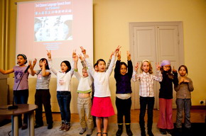 来自赫尔辛基市美湾学校的孩子们首先为观众演唱了《两只老虎》、《找朋友》等经典中文儿歌,地道的发音和童趣盎然的舞蹈引来了观众热烈的掌声。美湾学校是芬兰第一所使用芬汉两种语言、按照芬兰教育部大纲进行教学的芬兰公立学校,由中国国家汉办和赫尔辛基市教育局合作办学。