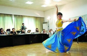 蓝裙黄衣的孔雀,随着快速变化的节奏,摆动着高昂的雀翎和灵动的腰肢,飘飞的裙摆漾动了赛场的空气。土耳其姑娘李霞一曲舞罢,技惊四座。爱笑的她说着“笑一笑,十年少”,表示只有得到幸福才叫生活。