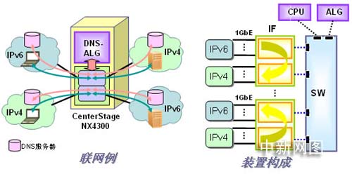 可以在ALG 刀片上搭载将DNS咨询进行IPv6-IPv4转换的ALG功能。与转换服务器刀片协作可以实现IPv6与IPv4的双方向通信。