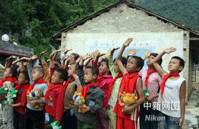 海尔小林希望小学的孩子们向国旗敬礼,表达他们对陈燮霞的祝福