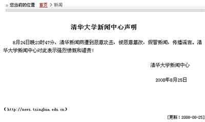 前天,清华大学新闻中心特为此发表了一篇声明,该声明中称,8月24日23时47分,清华新闻网遭到恶意攻击,被恶意篡改,假造顾秉林校长接受采访的新闻,传播谣言。清华大学新闻中心对此表示强烈愤慨和谴责。目前,清华新闻网已恢复正常运行。(记者 徐晶晶)