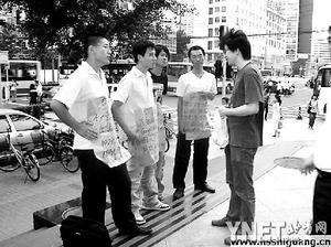 8月26日,在中关村核心区的银科大厦附近,4名男子手举写着“出售网站、网站维护、网站推广”等内容的纸牌子站成一排,这一场景被拍下照片上传到网络后引起了网友的关注,有人称他们是策划炒作。昨天,这一活动的主导者张涛称此一举动纯粹是偶然的,只是为了卖掉12个不赚钱的小网站,没有炒作的意图,他没想到引起了这么多人关注。