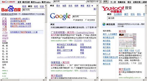 看到这个页面,你一定会觉得很“雷”吧!还有更“雷”的在后面,为验证搜索效果,记者尝试输入“南方网”进去搜索,发现搜索出来的结果、页面也是和百度、谷歌、雅虎一样,只不过是把三大网站搜索结果进行了并列排放。