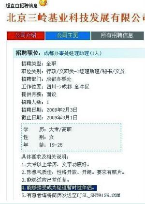 帖子里公布了一条转自四川招聘·成都招聘网2月3日的一则招聘启事。称“北京三岭基业科技发展有限公司招聘成都办事处经理助理,具体要求19~25岁的女性”。其中条件就包括了上述“暂时性伴侣”的雷人信息。随后登录成都招聘网发现该招聘启事已被删除。但根据发帖者提供的截屏,仍能看到相关内容。