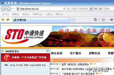 中新网5月21日电 5月19日,360安全中心监测到国内知名物流公司申通快递的官方网站首页被黑客“挂马”。大量经常登陆申通官网进行快件查询的用户,如果电脑中存在软件漏洞,就会被植入恶意代码,面临沦为“肉鸡”的威胁。截至5月20日上午,申通官网首页此次的“挂马”已经被清除。