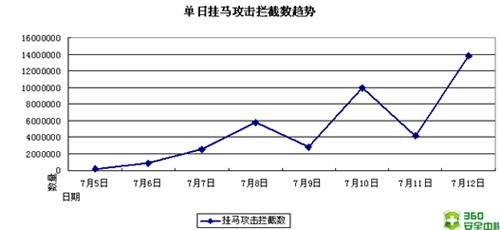 据360安全专家介绍,为避开安全厂商的封堵,周末和夜间时段历来是木马产业链活跃期。从7月8日到12日期间,不法分子针对微软MPEG-2视频0day漏洞的单日“挂马”攻击连续出现两次重大起伏。第一次为9日不到300万次猛增到10日的1000万次,第二次则是从11日的400多万次激增到12日的1381万次。截至12日15时,此次大规模网络攻击已累计导致12081家网站被“挂马”,“挂马”网页总数达91578个,而360安全卫士已累计为用户拦截了40216987次“挂马”攻击。