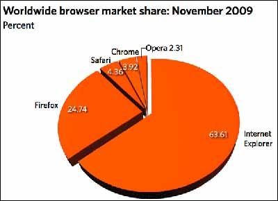 整体而言,IE浏览器市场份额为63.61%,Firefox为24.74%,Safari为4.36%,Chrome为3.92%,而Opera为2.31%。