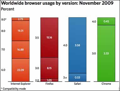 Net Applications数据显示,IE8的市场份额为19.31%,高于IE7的16.88%,但仍低于IE6的22.09%。根据目前发展趋势,IE8市场份额超越IE6指日可待。
