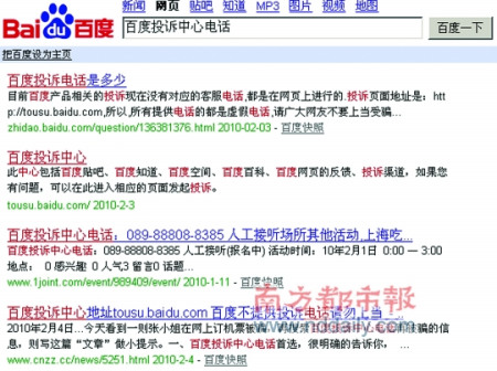 事态记者杨涛 报道 昨日,本报报道了山寨“百度投诉电话”被百度搜索置顶的离奇事件,昨日,记者追访此事时发现,电话区号为“0898”的山寨“百度投诉中心”已经不再置顶,但昨日晚间搜索时,该网站仍然位列搜索结果的第三位。只是随后的一条搜索结果提醒用户,“百度不提供投诉电话,请勿上当”。被骗的张小姐得知此消息后亦哭笑不得。她表示对此事报警的目的不在于索赔,但网络的管理实在有待加强。