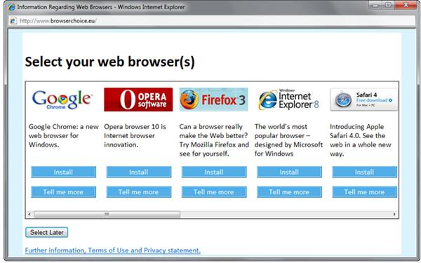 根据微软和欧盟达成的协议,微软同意在Windows 7中捆绑IE浏览器的同时,还提供其他浏览器安装选项,而这些浏览器的排列顺序是随机的。