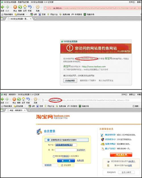 360安全浏览器拦截模仿知名网站的钓鱼网页