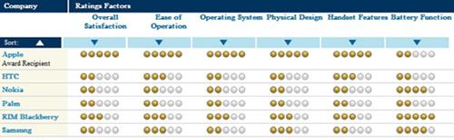 J.D. Power在手机的可操作性、操作系统、外观设计、功能和电池功能5大方面进行了调查,iPhone在前四项中均获得满分,只有在电池方面略逊于竞争对手。