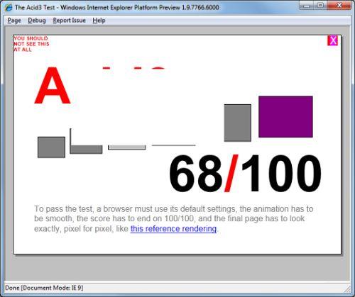 同时,微软还提供了IE9第二预览版的一些测试结果。在Acid 3测试中,新版浏览器得到了68分,高于首个版本。