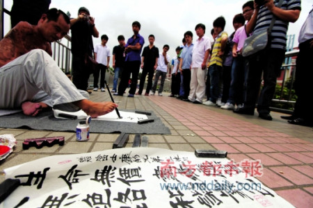 富士康先后发生“九连跳”,正当社会学家以及各界纷纷出来指出富士康公司种种问题时,昨日,有脚书绝技的残疾人郭乙传,到富士康大门外天桥上写励志语“尽孝应先,和谐靠己”。中午一小时内,郭乙传赠送出5幅字幅。
