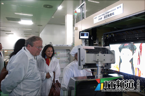 在长虹虹欧公司的新型等离子显示屏生产线,孟多夫拿着放大镜仔细查看,不住赞叹:“喔,喔,喔,想不到中国企业的制造已经达到了这么高的水平。”孟多夫及夫人走到PDP点灯检查机前,看着技术人员在触摸监控屏上快速的操作,不由凑近仔细查看询问。