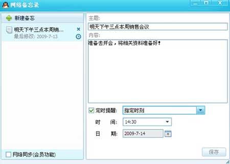 很多朋友都有“健忘”的小毛病,一些不重要的事情忘了倒没什么,公司的一次重要会议要是忘记了,后果就严重了!QQ2009中内置了网络提醒功能,可以将一些重要事件提前添加到提醒列表中,这样就不会因小毛病而误了大事。单击主面板中的“菜单→工具→网络备忘录”,在打开的窗口中设置好具体的提醒内容及提醒时间即可。提醒的时间可以具体到某个点也可以设置每天、每周的某个固定时刻的提醒。如果是QQ会员,还可以设定“自动漫游”,这样在任何一台可上网的电脑中,之前设定的网络提醒都有效。