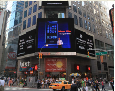 由于成为美国近一周来媒体关注的焦点,作为纽约地标建筑的时代广场新闻电子大屏对《Yulong Launches Coolpad N900 in China to Combat iPhone》的新闻进行了长时间的播报,中国手机新力量可能对iphone产生的冲击引起了美国社会的广泛关注,这也是国产手机首次亮相纽约时代广场。