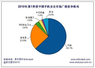 在国内的手机安全厂商中,网秦以63.1%的市场占有率名列第一,信安易占23.9%名列第二,360安全卫士拥有3.8%的市场占有率名列第三。