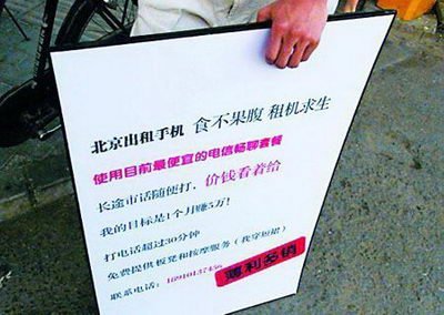 记者在论坛上看到,发帖的网友表示参照之前“强人”给她整理的手机赚钱指南,花费50元做了两块广告牌便和妹妹一起出租手机开始创业。论坛帖子中还附带了网友举着广告牌在北京的地铁站做宣传的图片。广告牌上写着“北京出租收集,食不果腹,租机求生,使用目前最优惠的套餐,长途市话随便打,价钱看着给,我的目标是1个月赚5万!打电话超过30分钟,免费提供板凳和按摩服务(我穿短裙)”。该名网友称,“目前成本已经挣回,滚滚大洋正在朝我们奔腾而来,大家还有什么高招赶快说”。昨日,记者曾尝试拨打广告牌上的联系方式与该网友联系,但被告知为空号。