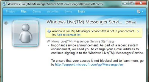 这个声明称,作为最近系统升级的一部分,我们需要你们修改你们的电子邮件地址以便继续登录Windows Live Messenger服务。为了保证你的访问不被封锁和了解更多的内容,请访问微软技术支持网站/gp/Messenger/en。