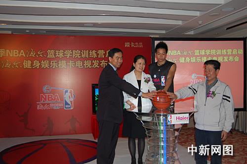 中新网4月29日电 “2009’NBA海尔篮球学院”训练营昨日在上海启动。作为合作伙伴,NBA中国区副总裁杨东为先生和海尔集团品牌总监张铁燕女士分别表达了对2009NBA海尔篮球学院训练营的期望及祝福,同时,NBA总裁大卫.斯特恩以及NBA现役球星德文.哈里斯也通过现场视频传达了来自大洋彼岸的祝福。