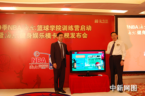 秉承NBA的体育及娱乐精神,在此次启动仪式上,作为NBA官方指定使用电视产品——海尔彩电推出了健身娱乐模卡电视,并发布了“云媒体”战略。海尔集团信息产品本部总工程师翟翌立博士介绍,海尔推出“健身娱乐模卡”电视旨在让更多的人足不出户就可以快乐健身并体会NBA精神。同时,随着网络时代的来临,针对不同使用习惯用户的需求,海尔彩电推出了“搜狐在线网络模卡”和“迅雷下载网络模卡”,使得人们可以在家通过电视一键上网看高清大片,还将联合更多的网络内容提供商,让用户无需担心个人储存设备空间的限制,可以随时、无限量地自由选择自己所需要的网络内容资源。
