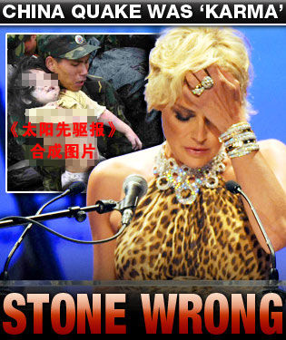 莎朗斯通那些违反人类道德的言论,遭遇全民谴责。西安的一些音像店昨日已将与她有关的作品下架,其网络下载电影也遭到网友抵制。记者还发现,在一些美国网站上,美国网友也展开了对她的批判。