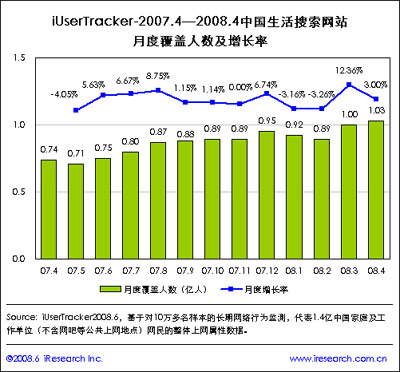 近日,艾瑞咨询发布国内首部《中国生活搜索行业市场研究报告》。报告显示,截至2008年4月,国内生活搜索覆盖人群已经超过1.03亿,较去年同期增幅39%,超过网络游戏用户数量5700万,已经成为中国网民上网的主流应用。
