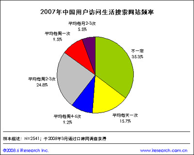 国家工业和信息化部公布的信息显示,截至08年2月份,我国网民数达2.21亿人,超过美国居全球首位。而截至2008年4月,国内生活搜索覆盖人群已经超过1.03亿,较去年同期增幅39%。在口碑网上完成的对网民调查显示,约有59.2%的用户每周至少访问一次生活搜索网站,查找生活服务商家的信息或发布相关生活服务需求,其中将近24.9%的用户几乎每天都会访问生活搜索网站,仅有不到4成的用户没有确定的访问习惯。报告认为,正是基于用户对于本地生活信息的需求促使生活搜索网站的出现。从目前访问次数看,生活搜索网站已成为众多网民日常生活比较依赖的工具之一。