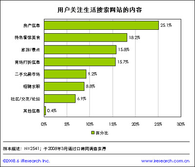 调查数据显示,用户感兴趣的生活服务信息集中在四大类,其中美食占18.20%,旅游占15.83%,商家打折15.66%,房产25.09%,在房产信息中,出售房屋信息关注度最高,占到总整的6.4%,相对而言,其它类似家政、交友、招聘信息关注的程度较小。