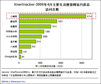报告指出,经过几年的发展,国内生活搜索发展的格局日趋明朗,口碑网、酷讯、赶集网等网站逐渐脱颖而出。其中,借助阿里巴巴集团强劲的资源优势,2004年成立的口碑网已发展成国内最大的生活搜索网站。其用户月度总访问次数3194万次,几为第2位的酷讯网1821万次和第3位赶集网1516万次的总和。在人均月度访问次数上,口碑网也以1.85次居榜首。