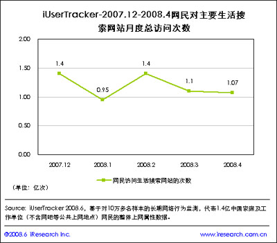 调查显示,2007年12月用户对生活搜索网站的月度总访问次数为1.04亿次,2008年1月份显著下降,为0.66亿次,艾瑞考察整体网民总体的访问次数发现,出现这一现象的原因在于网民的总体访问次数整体呈下降趋势,主要受元旦和春节等节假日影响;此后网站访问总次数呈稳步上升趋势。