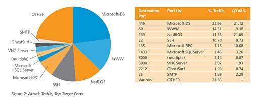 攻击针对20800个独立端口,相当于第三季度的8倍多。其中,针对445端口(Microsoft-DS)的攻击最多,约占来自美国和俄罗斯的25%
