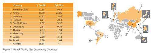 据国外媒体报道,2008年第四季度,美国首次成为全球最大的黑客攻击源,中国和瑞典分列二、三位。中国台湾和韩国也位列前十。