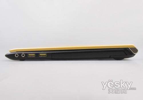 机身右侧除了占用空间最大的光驱模块插槽外,还加入了音频I/O接口以及一对USB2.0接口,可用于外接USB存储或控制设备,并为需要辅助供电的设备提供更方便的双接口设计。