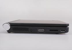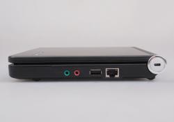 昭阳M10的机身侧面接口比较简单,但也涵盖了基本的使用需求。机身前端没有设置任何功能接口,不过内置了一组双声道立体声音响,在闲暇时放上一段舒心的音乐也是不错的选择。机身右侧设置了一对音频I/O接口、一枚USB2.0接口、一枚RJ45网络接口以及转轴上的安全锁孔,左侧除电源插孔外还加入了VGA视频接口、SD读卡器以及USB2.0接口,足以满足外接存储设备或显示设备的需要。