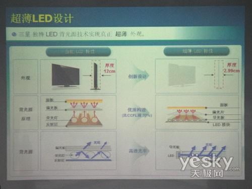 再说背光源与侧光源的区别,根据上图我们可以看出,与传统LCD光源组件和投射原理相比,LED侧光源由机身两侧发出光源,通过三星内置的高透光率的导光板的作用,使光线投射到面板上。限制LCD厚度最大的就是荧光灯的厚度,侧光源位于两侧的投射位置,使得其并不占据电视厚度的空间。