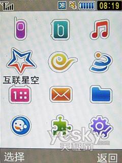 在界面方面,该机延续三星传统风格,12宫格的主菜单平铺出主要功能,待机桌面可以显示或关闭钟表和日历,五维导航键支持快捷操作。