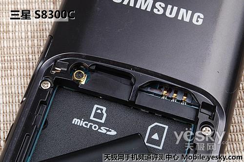 三星S8300C电池仓空间不大,microSD卡槽和SIM卡槽并排分布在电池仓上方。但由于电池的阻碍,该机并不支持储存卡热插拔。