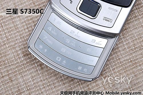 三星S7350C机身三维为109 x 50.45 x 12.6mm,正面金属拉丝质感的设计,让手机显得颇具太空气息。2.6英寸的TFT屏幕不支持Touch操作,也减少了指纹和油污对屏幕干扰。