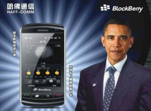 据美国媒体报道,日前,美国总统巴拉克奥巴马的形象出现在中国一款仿黑莓BlackBerry Storm 9500手机的宣传海报上。