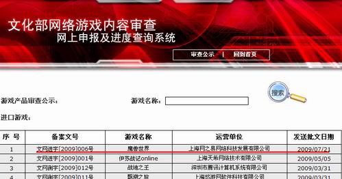 中新网7月21日电 今天,根据文化部网络游戏查询系统网站()上的信息显示,由上海网之易网络科技发展有限公司引进的网络游戏《魔兽世界》正式通过审批,批号为文网进字[2009]006号,批文送发时间为2009年7月21日。