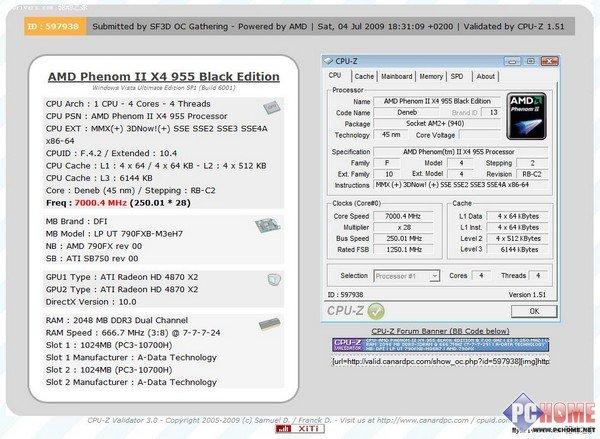 本周,由AMD特别提供的极品特供处理器Phenom II 42 TWKR在开启四颗核心的情况下,成功冲击了7GHz大关,创造了4核心处理器的最新世界记录(默认频率:2.0GHz,超频幅度达到250%)。