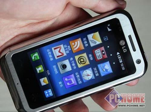 LG KM900的整个机身尺寸为105.9×55.3×11.95mm,重约105克 ,相比iPhone来说还是要小一号,下图就是该机与iPhone的对比图,大小差距十分明显。 虽然个头不如iPhone大,但是该机的屏幕也不小,KM900采用的是一块3英寸大1600万色的TFT屏幕,分辨率更是达到了480×800 像素,屏幕大小与LG Viewty相同。该机的屏幕采用的是电容式触摸屏,因此支持多点触摸功能。