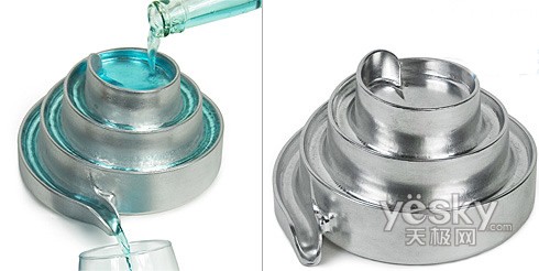 急冻冷饮池看上去就像是小区花园假山和喷泉的缩小版,全金属材质,上面是一圈一圈螺旋向下的水槽。平时,将急冻冷饮池扔进冰箱冻着,需要的时候取出来放桌子上,把想喝的东西从顶上的水槽入口处倒进去,然后,顺着螺旋水槽一路向下后,流进你杯子的就是一片沁人心脾了,而且由于整个过程没有添加其他的东西进去,所以绝对保证原汁原味。