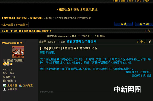 记者登陆《魔兽世界》中文官网临时论坛发现,网易已于昨晚发布《魔兽世界》例行维护公告,公告称,为了保证服务器的稳定运行,将于11月3日凌晨 3:00 开始对现有全部服务器进行例行维护,停机时间预计为12小时左右。同时“客服电话服务”也将暂停12小时。