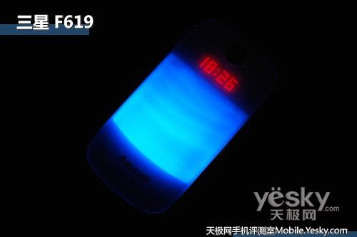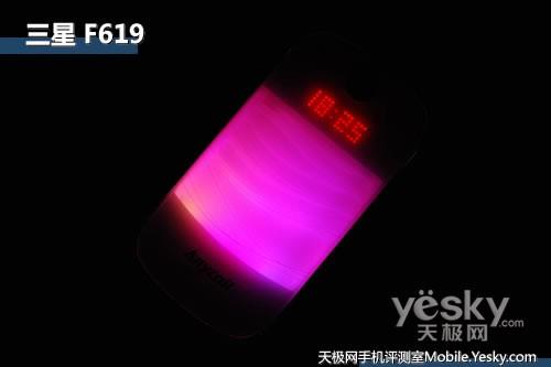 三星F619手机机身正面加盖了水晶壳,在其下隐藏着七彩瀑布灯与LED数字灯光(在手机设置中,LED数字灯光被称之为魔力亮点),在来电、短信或者播放音乐时,外部瀑布灯都会有相应的事件启动。